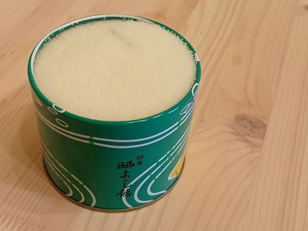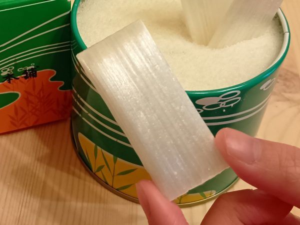 ところで、缶内に充填している粒(菓子種)は何だと思いますか? これは、でんぷんを原料としていて、食べられるとのこと。てんぷらの衣に入れたり、フライパンで軽く炒って砂糖と塩少々で味付けすると、香ばしいお茶請けにもなるそう。飴を食べ終えたら試してみよう♪