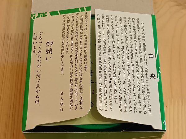 外箱を開けると、晒よし飴の由来を知ることができます。