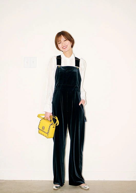 「大好きなベロア素材のオールインワンに、ココディールのフリルブラウスで甘さを、イエローのバッグで華やかさをトッピング」