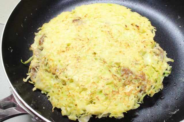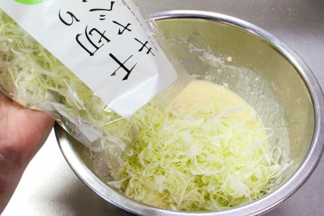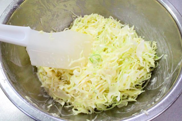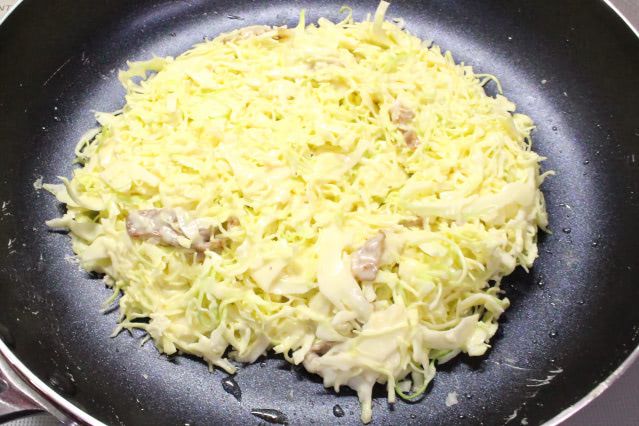 全体を混ぜ合わせると、生地はキャベツにまとわりつく程度。キャベツがたっぷり入っていることが、見て取れますね。