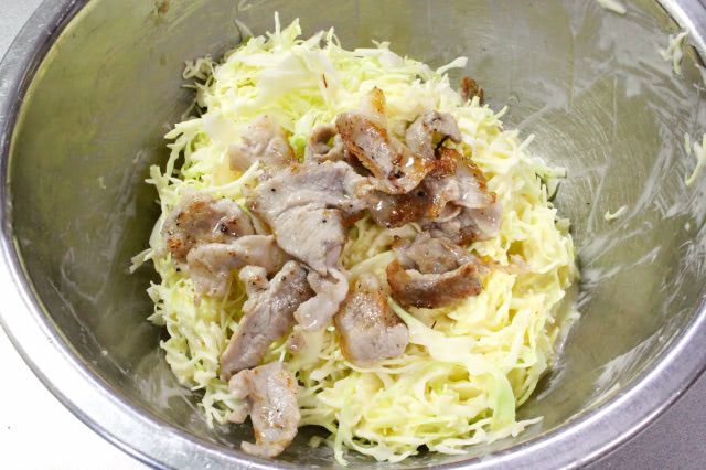 焼いた豚肉を生地に混ぜ込むのが、ポイントです。こうすると豚肉がやわらかく焼け、生地に旨味も付くそう。豚肉をまんべんなく生地に混ぜ込みました。