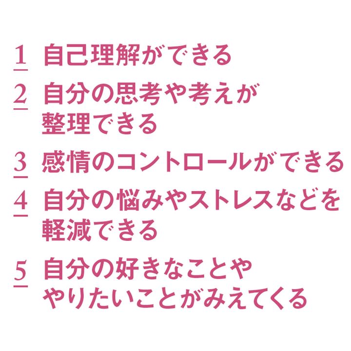 自分の感情や考えを書いて可視化すると、頭と心が整い、自分らしい人生を送ることができるように。続けることで自分を深く知れるため、行動習慣も思考習慣もそして人間関係まで変わります。また、日々の生活が整うのもメリットです。