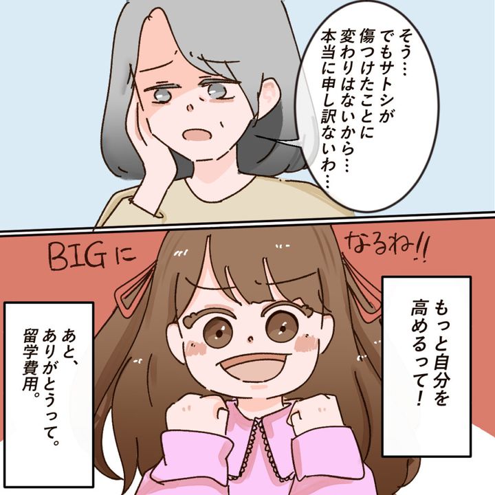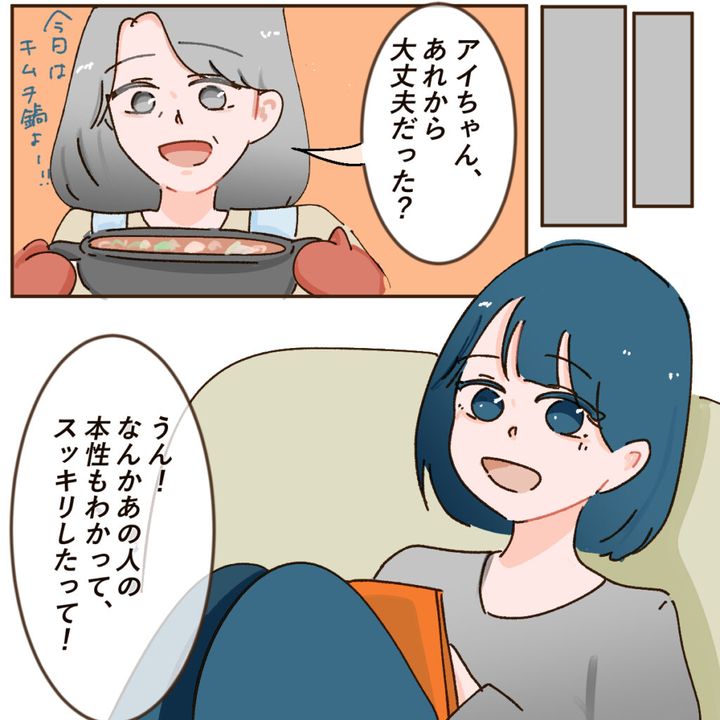 それからしばらく経ち、お母さんとふたりで幸せに暮らしているサキさん。「アイちゃん、あれから大丈夫だった?」とお母さんが聞くと、「ウン!なんかあの人の本性も分かって、スッキリしたって!」とサキさんは明るく答えました。