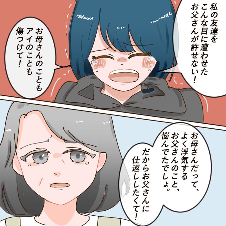 友達のこともお母さんのことも傷つけた父親を許せないサキさん。父親の頻繁な浮気でお母さんが悩んでいたこともサキさんは知っていたので、「お父さんに仕返ししたい」とお母さんに訴えました。