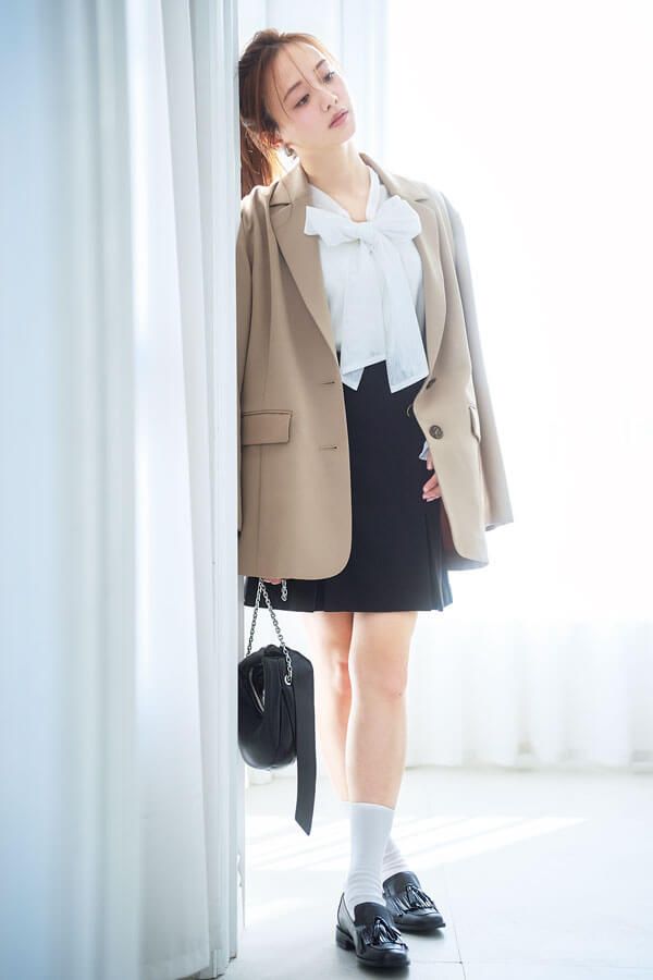 ジャケット¥16,995/NATURAL BEAUTY BASIC ニット¥9,790/WILLSELECTION(WILLSELECTION ルミネエスト新宿店) ミニスカート¥11,900/And Couture(And Couture ルミネ新宿店) ソックス¥440/FUN by FUKUSUKE(福助) バッグ¥9,900/CHARLES & KEITH フープイヤリング¥29,700/Grosse(グロッセ・ジャパン) ローファー¥26,400/銀座かねまつ(銀座かねまつ6丁目本店)
