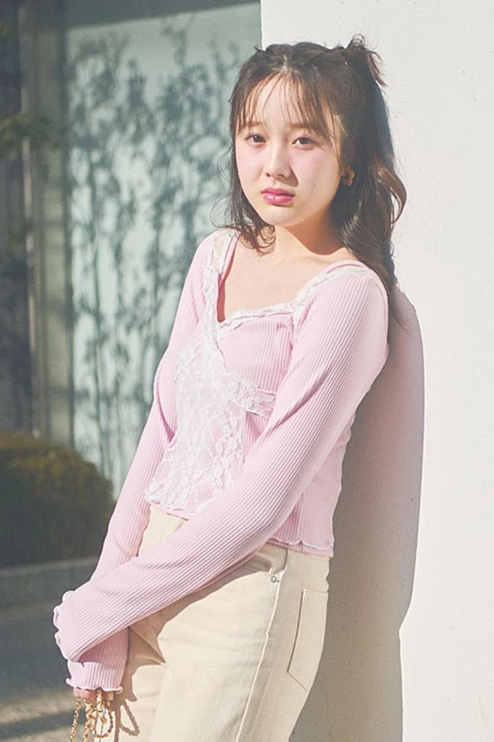 ピンク×レースの糖度高めのトップスは、シンプルなデニムパンツでほどよく崩すのが正解。