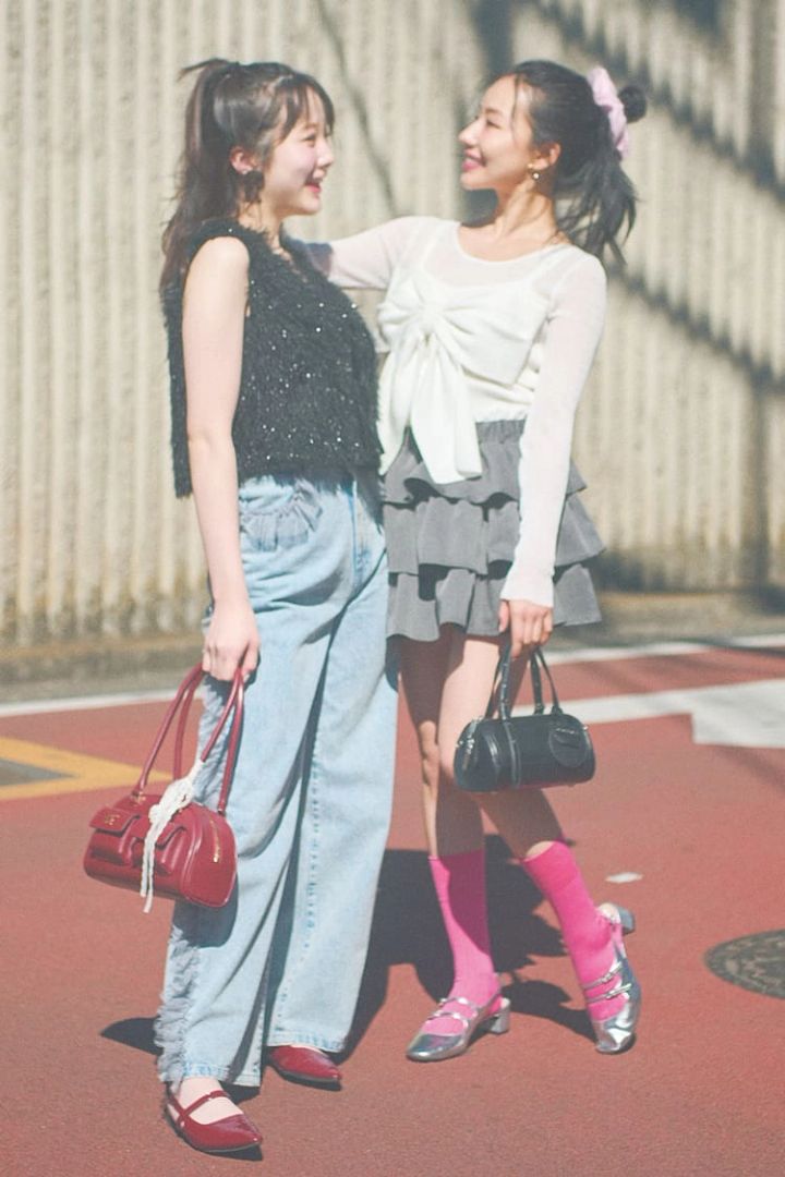 〈右・紗英〉白シアーニットトップス 7,700円/RESEXXY 白ニットビスチエ 14,300円/Candy Stripper グレーミニスカート3,959円/PHILLY シュシュ 2,190円/NADIA FLORES EN EL CORAZON イヤリング 1,100円/Osewaya(お世話や)ソックス 2,640円/ホイサムバッグ 11,900円、パンプス 9,200円/ともにチャールズ&キース(チャールズ&キース ジャパン)〈左・紗来〉黒フラッフィーベスト 9,790円/LILLIAN CARAT(リリアン カラット) チュールデニムパンツ 13,200円/merry jennyイヤリング 2,310円/ Osewaya(お世話や)バッグ 19,360円/ノットユアローズ(HANAKOREA) パンプス 3,990円/神戸レタス