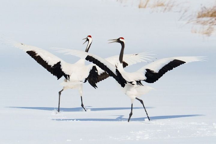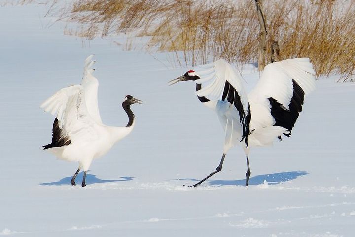 2羽のタンチョウが顔を合わせながら、翼を広げ、鳴き声をあげたり、飛び跳ねたりを繰り返します。