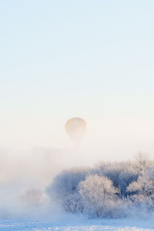 十勝川温泉付近で行っているアクティビティの気球です。これまでにも何度も同じ撮影スポットで、気球と景色のコラボを狙いましたが、この日が今までで一番幻想的に『霧氷と気球』を撮影でき、お気に入りの一枚になりました。## 撮影スポットの決め方