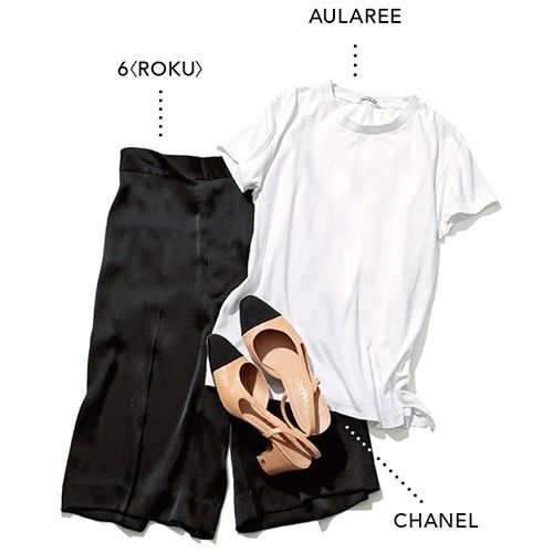 真夏は毎年白T+デニムがどうしても多くなるから、「その前に白Tでしたいこと」で考えてみました。今なら似た丈でもスカートよりシャレて見えるハーフパンツを選択し、足元はシャネルのミュールで品よく。コンパクトな白Tのセレクト自体もポイントです(樋口さん)