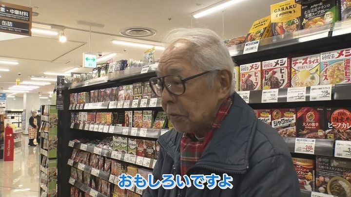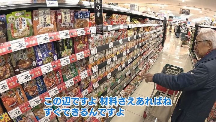番組スタッフ:「今は何を探して迷われてましたか?」男性:「簡単に混ぜりゃできるようなやつあるじゃないですか。あ、あれだ。この辺ですよ。材料さえあればね、すぐできるんですよ。うまいんですよこれ」