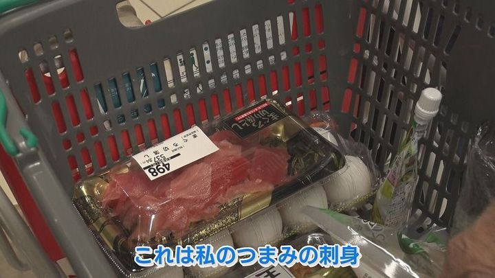 番組スタッフ:「今どういうものをお買いになられていますか?」男性:「おでんの材料と、これは私のつまみの刺身」