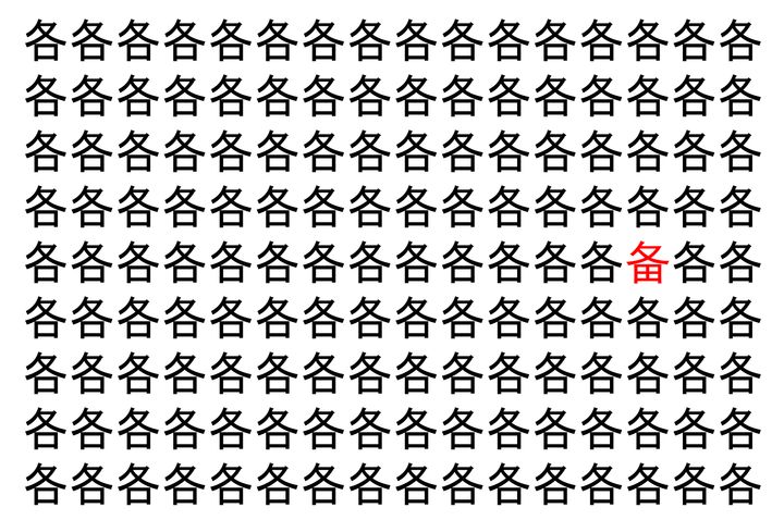 画像の中には、「各」という漢字が縦に9行、横に16個並んでいます。 全部で144個となりますが・・・、そのうち1つは「異なる漢字」となってますよ!!