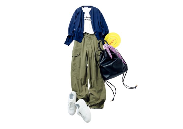 ハイネックアンサンブルニット(カーディガン)¥18,920/マイストラーダ ロゴTシャツ¥4,990/アンフィーロ(オンワード樫山) カーゴパンツ¥11,000/デッサン(ワールド) リュック¥17,600/Stola. スニーカー¥2,990、ペイズリーバンダナ¥990/ともにGU ケロリン桶/編集部私物