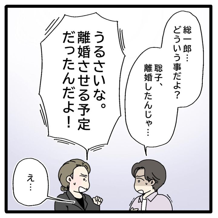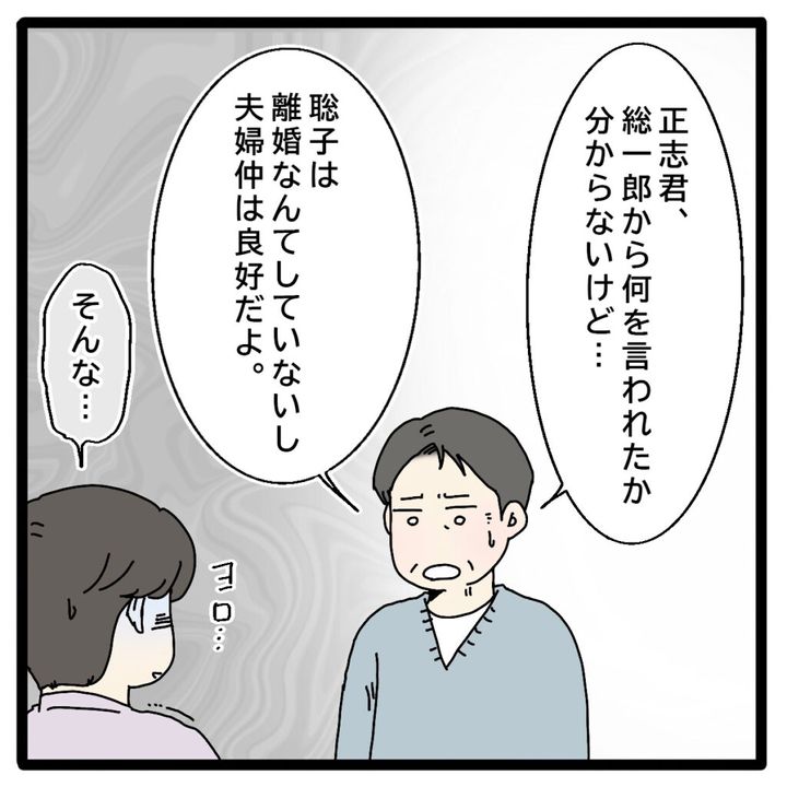 総一郎さんのお父さんは言いずらそうに「正志君、総一郎から何を言われたか分からないけど・・・聡子は離婚なんてしていないし夫婦仲は良好だよ。」と言うと正志さんは「そんな・・・」と青ざめました。