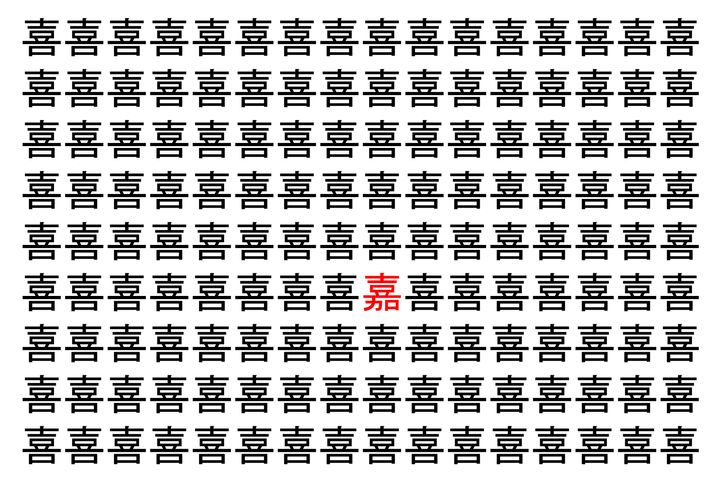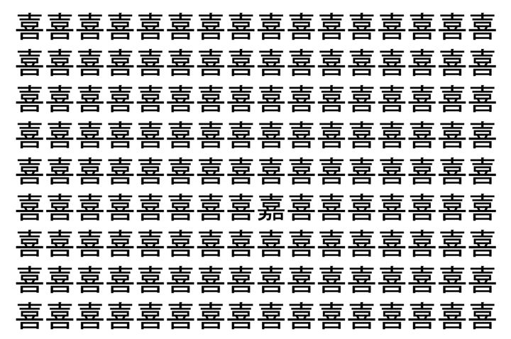 画像に並んだたくさんの「喜」という漢字。 その数144個なのですが・・・、実はその中に1つ違う漢字が紛れ込んでいます!!
