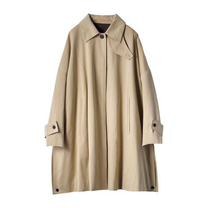 裾にかけて広がるテントシルエットが魅力の〈サロン アダム エ ロペ〉のコート。ウールの産地として世界的にも名高い尾州のテキスタイルメーカー〈タッカ〉の素材を採用し、シャンブレー生地特有の陰影と、ヴィンテージ感のある風合いを楽しめる。襟を立てると、よりシックな印象に。同素材のハーフパンツと合わせれば、セットアップにも。