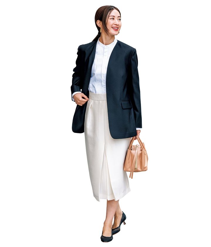 ノーカラージャケット¥14,990(アンフィーロ/オンワード樫山)シャツ¥44,000(デパリエ/デパリエ 伊勢丹新宿店)スカート¥31,900(マルティニーク/マルティニーク ルミネ横浜)バッグ¥69,300(メアリオルターナ/トゥモローランド)パンプス¥69,300(ペリーコ/アマン)イヤリング¥8,800(アビステ)