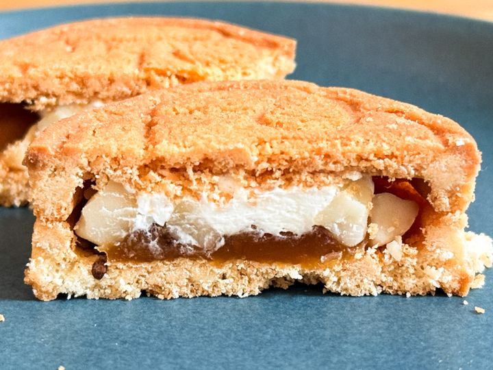 「アンニョンサンド」を食べてみると、まずクッキーのサクサク食感が心地よく、次に中のバタークリームとキャラメルが口の中でとろけていきます。甘すぎず程よいバランスの味わいで、コーヒーや紅茶との相性もよさそう。