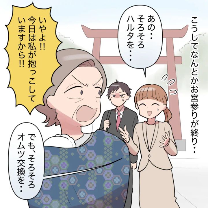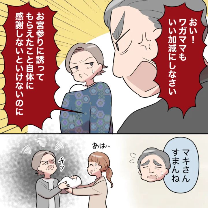 みかねた義父が「おい!ワガママもいい加減にしなさい。お宮参りに誘ってもらえたこと自体に感謝しないといけないのに」と義母に言った後、「マキさん、すまんね」と平謝り。義母は仕方なくマキさんにハルタくんを託しました。