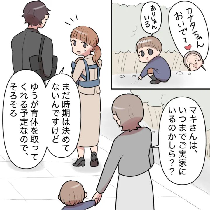 そして、「カナタちゃんおいで~」と今度はカナタくんに声をかけ手をつなぐと、「マキさんは、いつまでご実家にいるのかしら??」と歩きながらたずねます。「まだ時期は決めてないんですけど、ゆうが育休を取ってくれる予定なので、そろそろ」マキさんがそう言うと、