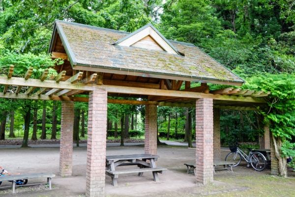 屋根付きのテーブルとベンチもあるので、急な雨でも心配なし。遊具から近い駐車場があるのも嬉しい。