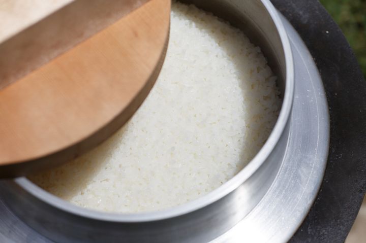 各回の作業後には、田んぼの畔で昔ながらの炊飯方法であるかまどを使用した羽釜での炊飯を行い、炊きたてのごはんでおむすびを作る体験もできます。