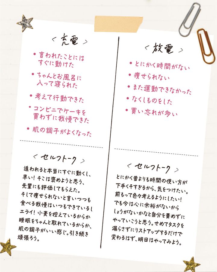 最旬の朝活“ジャーナリング”を知っていますか?“書く瞑想”のステップは3つありますが、まずはステップ1をマスター!1日にあった嫌だったこと=「放電」と嬉しかったこと=「充電」をどこかの15分で書き出してみて。