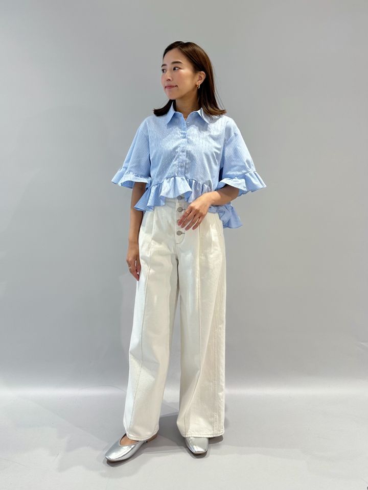 ペプラムシャツ(5分袖) by rokh ¥2,990(税込)[Mサイズ着用]ワイドジーンズ by rokh ¥3,990[Mサイズ着用]メリージェーンシューズ¥1,990(すべてGU/ジーユー)