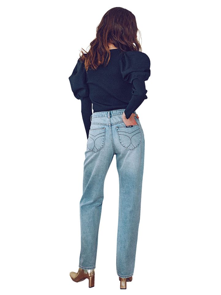 ブルーデニムのようなカジュアルパンツの格上げが図れる、着映えるそでの立体感。スタイルがよく見えるストレートデニムのシルエットにメリハリを創出。身ごろはフィット感のあるリブだから、タックインした後ろ姿もキレイ。足元は、デザインの華やかさに沿いつつ、デニムとも相性のいいゴールドブーツが適役。