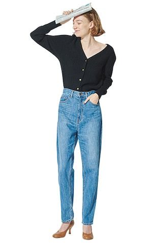 テーパードデニムの曲線フォルムを女性らしく引き立てるべく、デコルテが映えるVネックニットでキレイを上乗せ。たとえソックスを足してもやわらかく見えるまろやかなベージュのヒールが好相性。