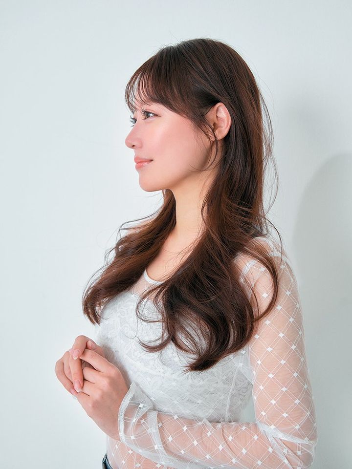 重めの肩下ロングを軽やかに見せるために入れた、顔まわりとサイドのレイヤーカットがポイント。リバースのシースルーなワイドバングで、さりげなく小顔見えも忘れずに。日本人の肌になじみのいいブラウンベースのカラーにブルーアッシュを混ぜて、透明感まで兼ね備えた無敵のロングヘアが完成。