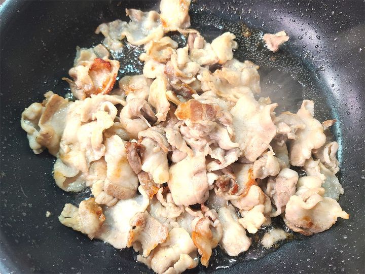 5. フライパンにサラダ油を引き中火で熱し、肉を炒めます。こんがり焼き色がつくまで炒めます。