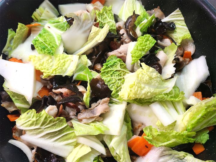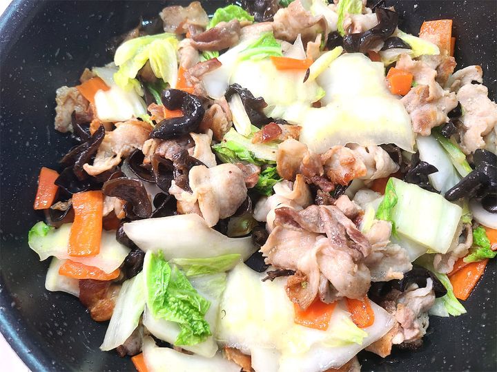 6. キクラゲ、切った野菜を入れ、塩をひとつまみ加えてよく炒め合わせます。