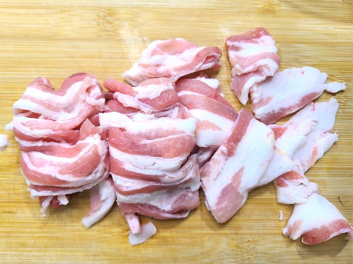 豚バラ肉も同様に食べやすい大きさに切ります。豚バラ肉には塩、こしょうをふっておきます。