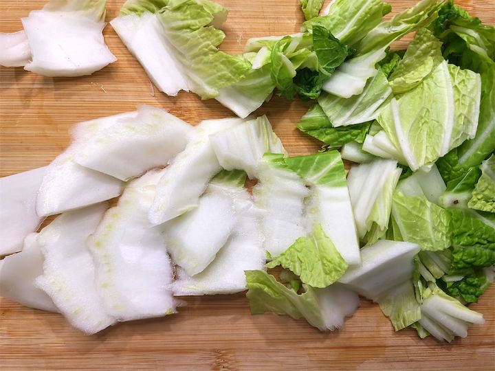 1. 白菜を3~4cmのザク切りにします。白菜の芯は厚いのでそぎ切りにしましょう。