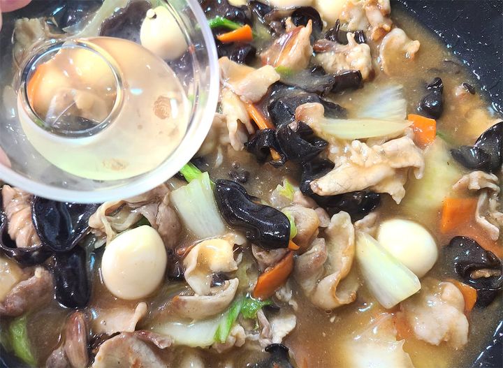 8. 調味液を加えたら弱火にし、うずらの卵を加えます。あとはとろみがつくまで絶えず混ぜます。
