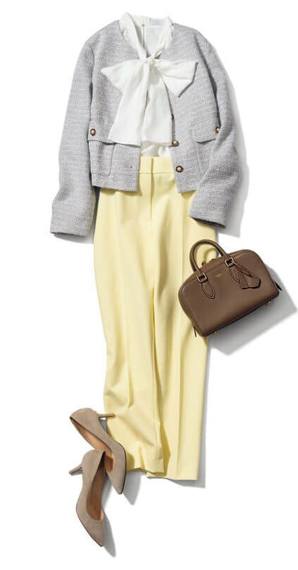 華感あるツイードジャケットとボウタイブラウスで、ベーシックなパンツを盛り上げて。ONらしいきちんと感を備えつつ、パンツの美色で鮮度も上々。