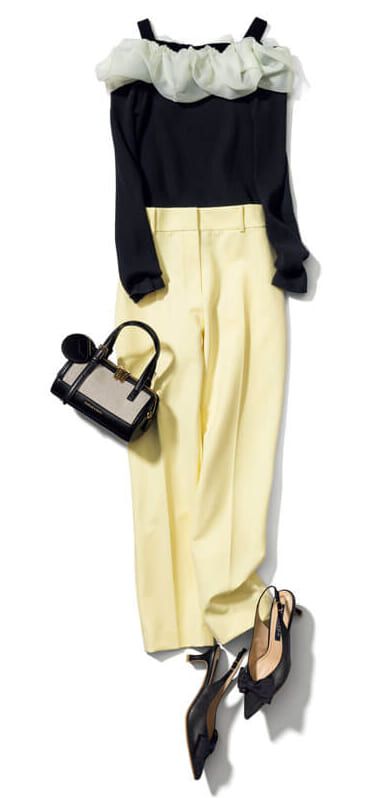 コンサバに転ばないよう、ほどよくインパクトのある甘トップスを選ぶのが成功のコツです! 首まわりをシフォンで飾ったニットは、パンツの淡い色みを引き締める黒ベースで大人な甘ルックに。