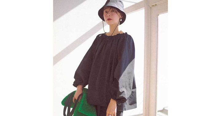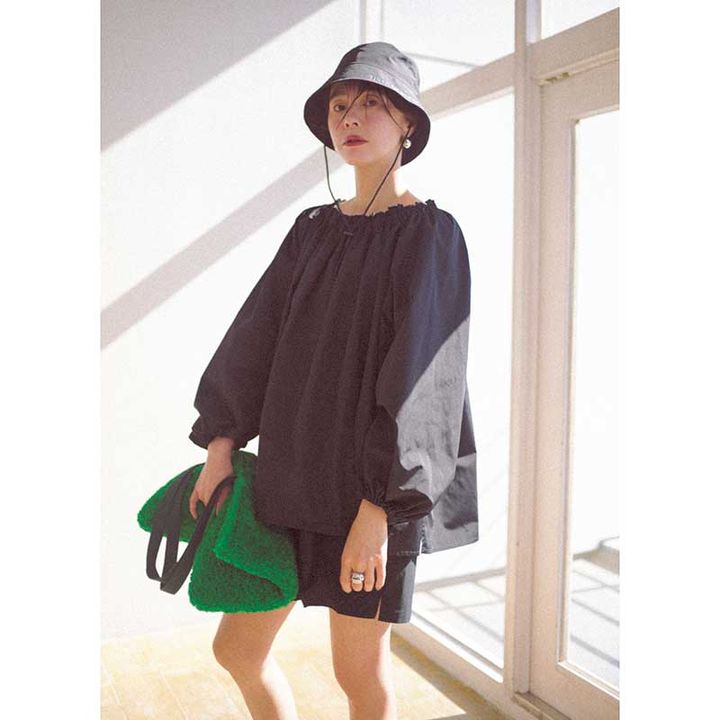 撥水ブラウス¥38,500(サードマガジン)撥水ショートパンツ¥25,300(サードマガジン)ハット¥5,940(すべてサードマガジン)ピアス¥3,960〈ヘンカ〉リング¥3,900〈soie〉(ともにロードス)バッグ¥7,500(トゥ)