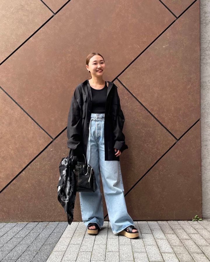 「今年トレンドのシアーシャツは、女性らしい印象になるところが魅力のアイテム。TONYWACKのシャツは、ほどよい透け感で品のいいスタイリングに仕上がります。ボトムには、5月からNOBLEでも取り扱いを開始するAGOLDE「Emmi Jean in Incline」のデニムを合わせ、そのほかはブラックにすることで大人っぽくまとめています。アメスリタンクはカップ付きなので、シャツを後ろに少し着流してチラッと肩を見せヌケ感を出すのがオススメです。今年はさらにスカーフにも注目!バッグの持ち手に結んだり、身につけたり、アレンジが効くので愛用しています」