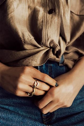 「えりを抜いたり、すそやそでのボタンをはずしたり。よく見るとシャツには「隙間」が多くある。その間を見つけて、飾って埋めるのもシンプルなシャツだからこそできる工夫のひとつ。たとえば、余ったすそをくるっと巻く。さらに余った部分をデニムのベルトループに通し、ウエスト部分をセルフデザイン」(樋口さん)