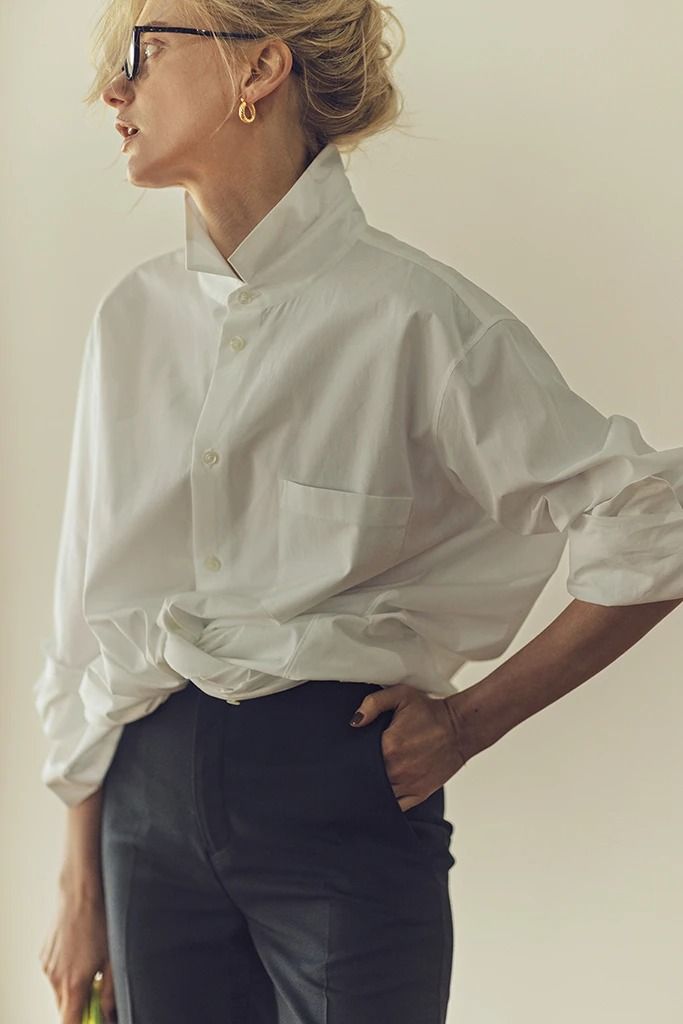 着るだけでさまになる白シャツは、着方を楽しめるのも長所。ロールアップで生まれる「フォルムの重み」。「肌を生かして」えりは詰めて・すそでさらなる重みを。「きっちり折り返したそでのロールアップに、腰位置でギュッとさせたすそ結び、えりは潔く立てて。ただの白シャツに見せない「つくり込んだ重み」が、シンプルなスタイリングのスパイスに」(樋口さん)