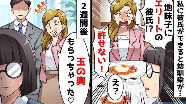 「今のイケメンは誰よ! なんでアンタなんかと一緒にいるの?」と詰め寄ってきたので、「……彼氏だけど。ちなみに、彼は大企業の御曹司よ」と答えると、A子は驚愕。「地味子のくせに! ハイスペ彼氏だなんて許せない!」と憤慨しています。そして彼女は、彼が立ち去った方向に走って行ってしまいました。