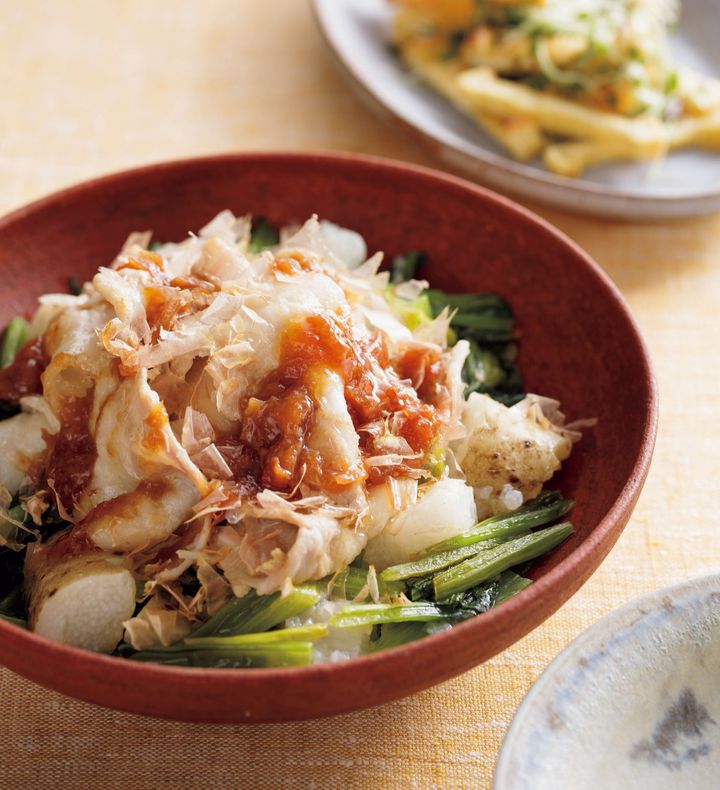 (2)フライパンに小松菜、長いもを順に広げ入れ、豚肉を広げながら全体にのせる。塩少々、酒大さじ1をふってふたをし、中火にかける。肉の色が変わるまで8分ほど蒸し、器に盛る。削り節をふって梅だれを回しかけ、全体を混ぜて食べる。