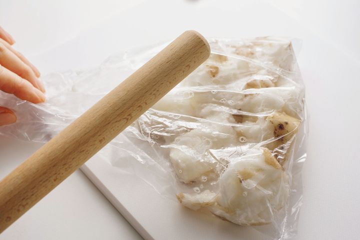 (1)小松菜は長さ4cmに切る。長いもはよく洗ってひげ根を取る。皮つきのままポリ袋に入れ、袋の上からめん棒などでたたいて一口大に割る。豚肉は長さを半分に切る。梅だれの梅干しは種を取ってかるくたたき、残りの材料と混ぜる。