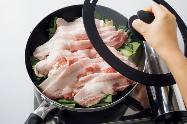 3. フライパンに入れるだけで、こなれた味!『豚バラと小松菜、長いもの梅だれ蒸し』