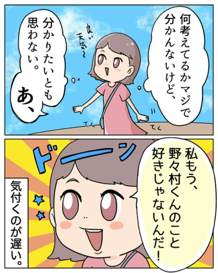 にしこさんが野々村くんの機嫌を直そうと、一生けん命話しかけますが、効果はありませんでした。ほんと、めんどくさいですね…。目も合わせたくない気持ち、よくわかります。そしてデートが終わったあと「解放された!」と感じたにしこさん。そして、ようやく「好きじゃない」ことに気づきました。