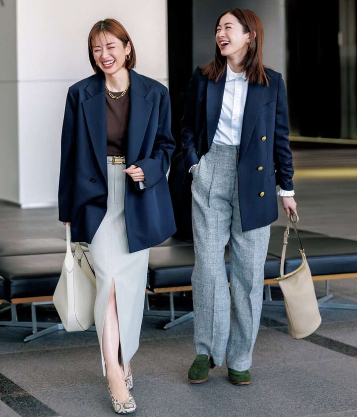左:マニッシュ but 女らしい、削ぎ落したシンプル美が秀逸。前スリットのベージュタイトで抜け感を。ジャケット¥77,000(デパリエ/デパリエ 伊勢丹新宿店)トップス¥16,500(セピエ/コラージュガリャルダガランテ 新宿ミロード店)スカート¥38,500(イウエン マトフ/ユナイテッドアローズ 六本木ヒルズ店)バッグ¥561,000(ヴァレクストラ/ヴァレクストラ ジャパン)パンプス¥129,800(セルジオ ロッシ/セルジオ ロッシ カスタマーサービス)ベルト¥24,200(ア ヴァケーション/エブール/リトルリーグ インク)ピアス¥39,600(ミチ ウィルウェイ/フォーティーン ショールーム)ネックレス¥154,000(ブランイリス/ブランイリス トーキョー)右:ほんのりタイト×丈長の計算し尽くされたマチュアなシルエット。クラシックな金ボタンや赤の裏地、「HELLO」のタグなど、手に取る度に高揚感が湧く、小ワザが集結。王道トラッドでまとめつつ、フリルシャツで可愛げをプラスして。ジャケット¥105,600シャツ¥40,700(ともにマディソンブルー)チェックパンツ¥44,000(サードマガジン)バッグ¥322,300(トッズ/トッズ・ジャパン)ローファー¥151,800(J.M. WESTON/J.M.WESTON 青山店)ピアス¥68,200(モニス/フォーティーン ショールーム)