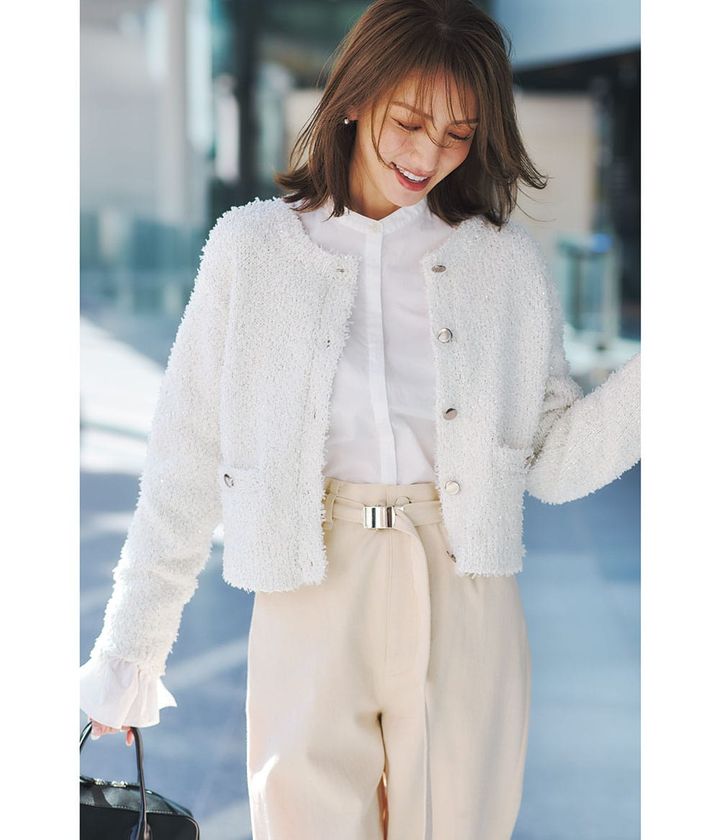 シンプルシャツ×パンツスタイルは素材感のあるツイードを重ねてコーデに立体感を。極上の華やかさを纏えます。